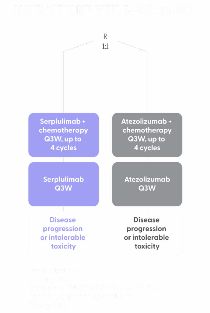 - Patients are randomized 1:1 to receive serplulimab or atezolizumab intravenously every 3 weeks until disease progression, intolerable toxicity, or death. All patients receive chemotherapy with intravenous etoposide and carboplatin every 3 weeks for up to 4 cycles7