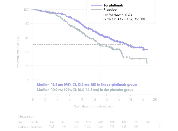 • Median overall survival of 15.4 months (95% CI, 13.3 months-not evaluable) in the serplulimab group compared with 10.9 months (95% CI, 10.0-14.3 months) in the placebo group
